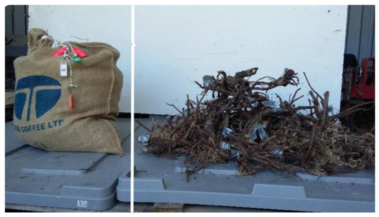 Storage of CRt and WRt was performed outside the building, under a farm shed. Specifically, chips from CRt were collected in jute bags while the whole roots from WRt treatment were piled up as shown in Figure 1 after being labeled and weighed individually.