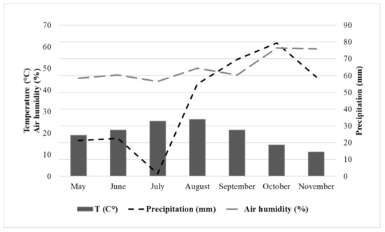 Trend of main climatic parameters: temperature (°C), precipitation (mm) and air humidity (%) recorded during the storage of cardoon roots from May to November 2020.