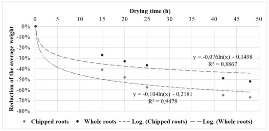 Reduction of the average weight of whole roots and chipped roots during drying in a thermo-ventilated oven at 60 °C.