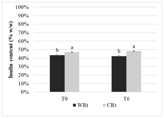 Inulin content at T0 (beginning of storage, immediately after drying) was 43.5 ± 0.65% and 47.1 ± 1.30% w/w in WRt and CRt, respectively (Figure 5). Drying time negatively affected the inulin content in WRt which resulted in 3.54% w/w lower than CRt. Conceivably, in WRt treatment, the inner tissues of the roots took longer to dry out than the outmost tissues of the same root. Hence, the metabolic activities naturally occurring in living cells stopped later and this partially explains the loss of inulin in WRt.