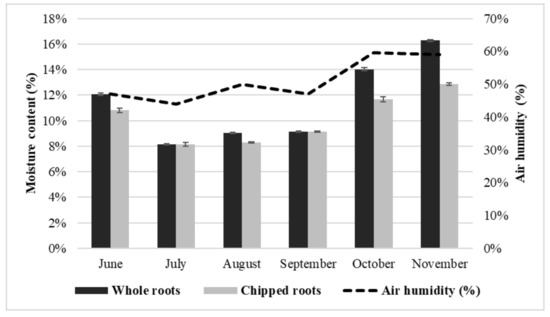 Moreover, the drying process can also benefit from chipping by reducing time and energy required [41]. According to our results, indeed, chipped roots could reach constant weight after 48 h, whilst whole roots needed 24 h more to dry completely (Figure 4).