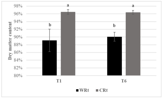 Dry matter content in dried whole roots (WRt) and dried chipped (CRt) roots at the first month of storage (June, T1) and after 6 months of storage (T6). Common letters denote the absence of significant difference (p < 0.05).