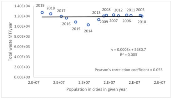 Correlation between municipal solid waste per year and the total population of cities in a given year (period of time 2005–2019).
