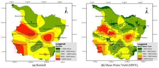 Based on the results of the analysis of the InVEST model, the volume of WY at RBU Citarum is around 12.17 × 109 m3/year, where this value is obtained from the average thickness of water 935.26 mm/year multiplied by the total area of the entire RBU (Table 3). This WY reflects natural river flow, not taking into account the use of water in human activity, such as by households, industry, and agriculture [10,13]. The Citarum Watershed has the highest annual rainfall (1.994 mm/year) with the lowest potential evapotranspiration (1.291 mm/year). With actual evapotranspiration of 649 mm/year, the Citarum Watershed produces the highest WY at 1.220 mm/year (Table 3). The producer of the second-largest WY is the Cipunara Watershed (1.126 mm/year), the third-largest is contributed by the Cimalaya Watershed (974 mm/year), and the fourth-largest is from the Ciasem Watershed (969 mm/year).