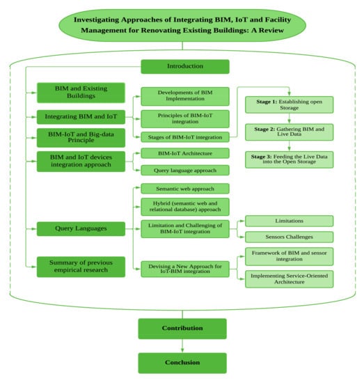 The paper is structured to contain nine sections include the Introduction. In Section 2, this paper discusses the relationship between BIM and the existing building. A discussion for integrating BIM and IoT are discussed in Section 3. Section 4 highlights implementing the big-data principles in integrating BIM and IoT. Section 5 illustrates the approaches to integrating BIM–IoT devices. Section 6 explains the query language. Section 7 contains a summary of previous empirical research. Section 8 highlights the contribution of this study, while Section 9 displays the conclusion.