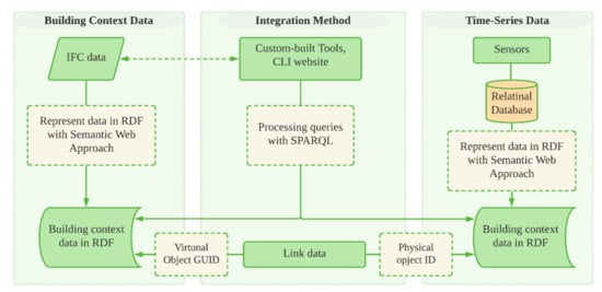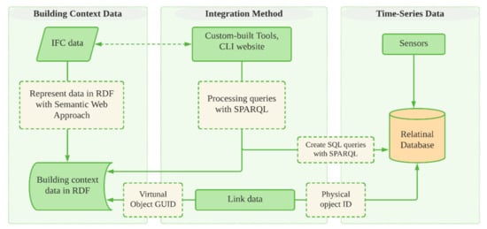 Hybrid and integration are two different approaches. As hybridization is “working, organizing, or doing something that is composed of elements of two separate systems”, the integration is “the act of bringing together smaller components into a single system that functions as one” [112]. In the hybrid approach shown in Figure 10, the Semantic Web and relational databases are used to store cross-domain data. Hybridization can be performed through feeding contextual information (building context data, sensor information, and other soft building information) into RDF format using a semantic web approach. Then, retaining sensor (time-series data) in a relational database. The mapping contextual information with time-series data is the last step which can be referenced in terms of sensor ID described in RDF [109].