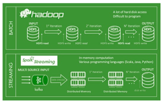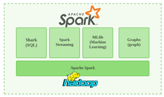 A schematic representation of the architecture and the steps involved in the analytics process of Hadoop and Spark frameworks is shown in Figure 6. The two frameworks involve a new form of MR called elastic MapReduce (EMR), which transfers MR to a system comparable to the cloud [95]. EMR can also run processing frameworks such as Apache Spark and HBase on Hadoop clusters for batch processing, querying, streaming, and machine learning.
