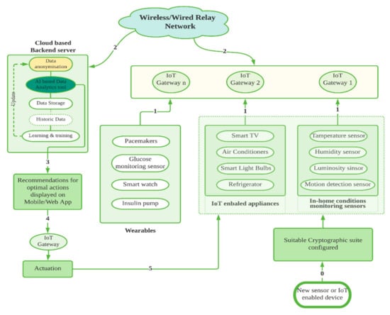 Figure 7 shows a proposed architecture where the data is collected from various heterogeneous IoT sources. The data then undergoes anonymization followed by processing and analysis using the artificial intelligence (AI) technique. The outcome of this data analysis is mainly towards optimization of some parameters of interest aiming at achieving a desired security and performance objectives. The process is carried out in terms of available resources throughout six phases: phase 0 through phase 5. Phase 0 is to perform security parameters configuration by employing cryptographic algorithms to cater to the confidentiality, integrity, and authentication requirements of the applications and systems using this specific device. Phase 1 is about data sensing and reporting where main IoT classes are distinguished while they will be utilized wither by being wearable devices or IoT appliances. Phase 2 deals with data aggregation and relaying where both need a decision which is target-dependence known as IoT gateway. The third phase (III) involves cloud-based data analysis for the data sent by IoT-gateway. Data analysis is carried out with preserving privacy since this information is made for the general population through Google.