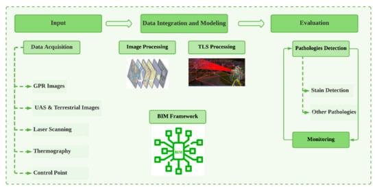 The existence of state-of-the-art in BHIMM for building refurbishment whether in general terms [41] or for existing buildings [42] has made a very important step towards integrating BIM with other tools. Despite that, more guidelines are still needed to achieve a complete “as-built” model featured with morphology (regular or irregular) of historical buildings hoping to finalize an accepted design of refurbishment and conservation interventions as noted earlier by [43] and recently by [44]. Meanwhile, researchers face a critical activity when BIM and a variety of information through independent and structured methods. Such information can be gathered from various sources such as historically archived documentation and analytical investigations in addition to taking surveys, diagnostics, monitoring, and continuous updating information during designing, execution, or performance assessment [39]. HBIMM can be used successfully in improving BIM ability to include tangible and intangible information for the existing buildings, in general, as reported earlier by [45] and later by [39]. This information could be available to managerial and maintenance stakeholders throughout the life cycle. Further, fortifying this information with real-time updates may help to centralize models by installing integrated monitoring systems [46,47]. The state-of-the-art was drawn up to achieve the following four purposes: a critical analysis of potentialities of HBIMM, formalizing the first attempts of HBIMM application, proposing a consolidated methodological flow, and suggesting diagnosis tools for future developments within an automation-based framework.
