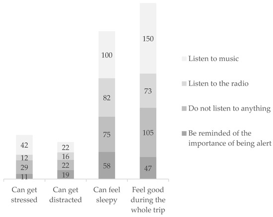 The answers to the question “What helps you avoid distractions the most” are indicated in Table 8. There is also a match between users with and without ADAS about the preferred method to avoid distractions, in both cases they prefer to listen to music. There are significant differences according to gender, similar to those with or without ADAS. 41% of women prefer to listen to music compared to 32% of men. In addition, for drivers without ADAS there are differences by age. Thus, 43% of drivers under 40 prefer to listen to music and only 10% prefer to listen to radio programs, compared to 21% of other age groups. For users of ADAS there are differences according to the country of the respondents. In Portugal, 49.1% prefer to listen to music while in Spain only 31.7%, the preferred option in Spain being to listen to radio programs (34.2%). There is also an association by age for users of ADAS. Drivers under 40 prefer to listen to music (45.4%) rather than radio programs (19.4%) while the preference of those over 60 is exactly the opposite: listen to radio programs (40.0%) and music (20.0%).