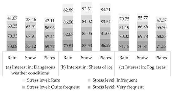 Analyzing the preferences of drivers about the information related to the weather that they would like to receive through the assistant, all drivers (with and without ADAS) would like to receive information on all aspects related to the weather that have been considered, especially on the presence of ice sheets on the road. This result is logical, since the presence of sheets of ice is the most dangerous weather factor for driving and notifications of the presence of ice could be decisive to avoid serious accidents. Likewise, the notification of ice presents significant differences depending on the country (p-value < 0.001), both for users without ADAS and with ADAS. Thus, in Spain, 89% would like to receive this information, compared to 69% in Portugal. This discrepancy in valuation may be due to geographical and climatic differences between the two countries as icy conditions are more frequent and dangerous on the roads of northern Spain.