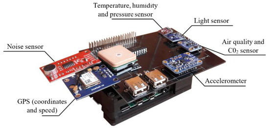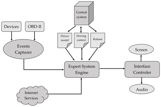 The prototype has been developed using a Raspberry-Pi to create an embedded device and the different sensors are connected to a printed circuit board, as shown in Figure 4. The local storage system for the data collected (by the sensors and through the vehicle’s OBD-II port) is based on SQLite, which helps not to overload the system. Data capture and storage is carried out every 0.5 s. As for the rule system, it is developed in Python using the engine provided by durable-rules (https://pypi.org/project/durable-rules/, accessed on 30 March 2021) to analyze the events and generate the response of the system accordingly. The graphic interface was implemented using the library provided by Tkinter, and the audio using Pygame. The knowledge base consists of a dictionary that contains both the driving status and the driver model so that it can be easily accessed.
