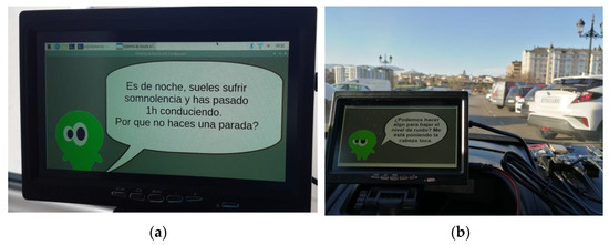 Table 13 presents a set of examples of the events and recommendations generated by the rules system. The parameters considered are selected only for demonstration purposes, since the variables will be generated and updated by the central system according to the specific driver. In Figure 5, two examples of the messages presented by the interface are shown. The rules take into account basic characteristics of the driver and the driving status to make recommendations of actions that would improve safety, comfort and focus.