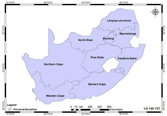 The Republic of South Africa is the southernmost country in Africa. The country is the 24th most populous nation in the world with about 59 million inhabitants. According to the general household survey of 2018, the percentage of households without electricity stands at 12.5% [3]. The administrative division is shared into nine provinces as indicated in Figure 1.