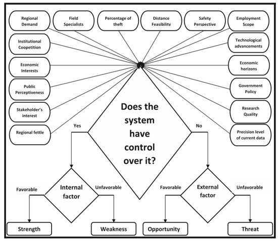 SWOT is an acronym for strengths, weaknesses, opportunities and threats. It is a well-structured comprehensive comparative analytical tool that is applied in strategic planning in a business environment [32]. The evaluation is based on internal and external criteria as explained by the educational description approach in Figure 4. In business organisation planning, the internal factors are examined to highlight and interpret the strengths and weaknesses. Similarly, the external factors are explored which are related to the opportunities and threats. Strengths represent all resources that are available and can improve business performance. The weaknesses are shortcomings which may reduce the profitability, efficiency and competitive gains of the business resources.