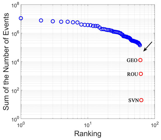 Sum of the number of events covered by GDELT vs. the ranking (in log-log scale) for BRI countries during a period from 2013 to 2019, where the countries are ordered according to the descending sum of number of events. Red dots are BRI countries with the sum of the number of events less than 13,000, which are Georgia (GEO), Romania (ROU), and Slovenia (SVN) respectively.