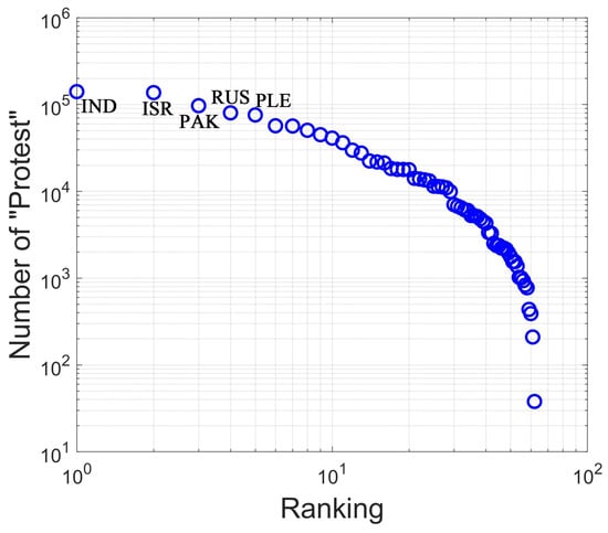 Number of “Protest” covered by GDELT vs. the ranking (in log-log scale) for BRI countries during a period from 2013 to 2019, where the countries are ordered according to the descending number of “Protest”. The top5 countries are India (IND), Israel (ISR), Pakistan (PAK), Russia (RUS), and Palestine (PLE).