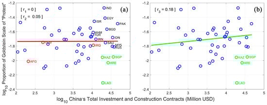 Scatter-plots between the proportion of Goldstein Scale of “Protest” and China’s total investments and construction contracts for BRI countries during the period of 2013–2019, where (a) shows that the correlation coefficient for all BRI countries is only (p = 0.736), while the coefficient is decreased to (p = 0.977) when the war-torn countries, Yemen (YEM), Afghanistan (AFG), and Iraq (IRQ) (which were denoted by red), were excluded. The red regression line refers to . The correlation coefficient was increased to (p = 0.264) but still almost zero, when four more countries, the United Arab Emirates (ARE), Lao (LAO), Singapore (SGP), and Kazakhstan (KAZ), which were denoted by green, were also removed; this is shown in (b), with the green regression line referring to .