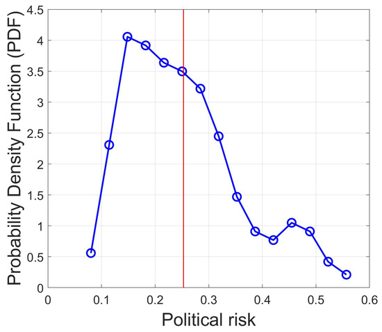By computing the political risk defined in Equation (1) and the Probability Density Function (PDF) of the political risk during the period from 2013 to 2019, Figure 5 shows that the PDF of political risk, where a mean of 0.25 is indicated by a red vertical line. The PDF suggests us to define political risk in 4 levels. Concretely, the interval 0.2 < ≤ 0.3, which contains a large probability when the political risk falls within this interval, is defined as the moderate level of political risk for BRI countries during the period from 2013 to 2019. The interval ≤ 0.2, which also contains a large probability similar to that for the interval 0.2 < ≤ 0.3, is defined as the negligible level of political risk. Two other intervals, 0.3 < ≤ 0.4 and > 0.4, both above average but containing much smaller probabilities than other two levels, are defined as high and extremely high level of political risk, respectively. This ensures that most countries along the Belt and Road are peaceful. Therefore, we find it appropriate to divide the political risk into 4 levels, including > 0.4, 0.3 < ≤ 0.4, 0.2 < ≤ 0.3, and ≤ 0.2. These 4 levels are called , , , , which represents extremely high, high, moderate, and negligible level of political risk, respectively. This classification will also be used when discussing domestic and international political risk below.