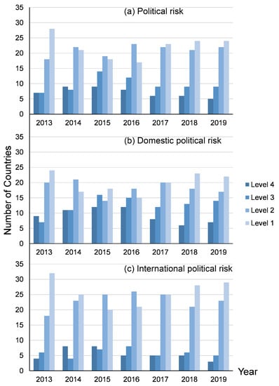 It is instructive to examine the temporal evolution of the number of BRI countries at different risk levels from 2013 to 2019. This is depicted in Figure 6. For the extremely high level of (overall) political risk, the number of BRI countries is 7, 9, 9, 8, 6, 6, and 5, from 2013 to 2019, respectively. For the high level of political risk, the number of BRI countries is 7, 8, 14, 12, 9, 9, and 9, from 2013 to 2019, respectively. These numbers sum to 14, 17, 23, 20, 15, 15, and 14, from 2013 to 2019, respectively. Therefore, the sum of the number of BRI countries with the extremely high and the high level of (overall) political risk reaches the peak in 2015, and decreases thereafter.