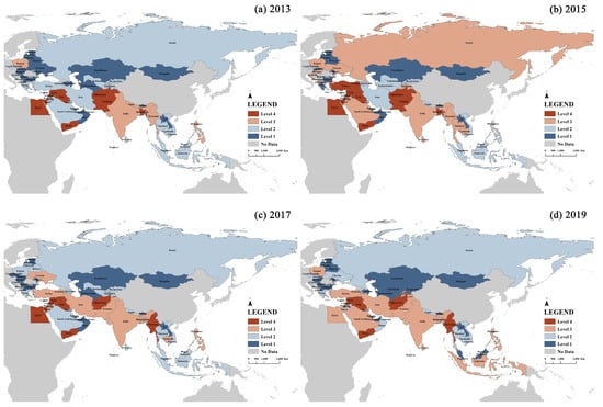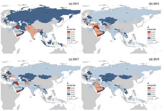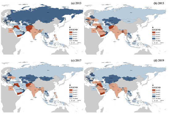 The spatial evolution of the political risk along the Belt and Road is shown in Figure 7. We find that Syria, Iraq, Yemen and Palestine exhibited the extremely high level of political risk in all these four years. They are followed by Afghanistan, Lebanon, and Israel, which exhibited the extremely high level of political risk in at least two of these four years. It should be emphasized that the nature of risks these countries faced was quite different. For example, Syria’s risk has been mainly caused by the continued Syrian Civil War and attacks from the Islamic State of Iraq and the Syria (ISIS, a terrorist organization designated by the United Nations). The spillover of Syrian Civil War into Lebanon (2011–2017) impacted Lebanon greatly. In Iraq, the ISIS is also the main cause of risks, which even caused the Iraqi Civil War (2014–2017) with the Iraqi Forces. In contrast, Yemen has been struggling with the Yemeni Crisis (2011–present) and the Yemeni Civil War (2014–present). In fact, when the Yemeni Civil War erupted, Saudi Arabia made an armed intervention in Yemen. As for Afghanistan from 2001 to the present, there have been many wars and attacks, such as the assaults by Taliban and the Kabul attack. Palestine has been mainly struggling with the ongoing Israeli-Palestinian conflict.