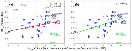 Scatter-plots between political risk and China’s total investment and construction contracts for BRI countries during the period of 2013–2019, where (a) shows that the correlation coefficient for all BRI countries is only (p = 0.28), while the coefficient is increased to (p = 0.026) when the war-torn countries, Yemen (YEM), Afghanistan (AFG), and Iraq (IRQ) (which were denoted by red), were excluded. The red regression line refers to . The correlation coefficient was further increased to (p < ) when four more countries, the United Arab Emirates (ARE), Lao (LAO), Singapore (SGP), and Kazakhstan (KAZ), which were denoted by green, were also removed; this is shown in (b), with the green regression line referring to .
