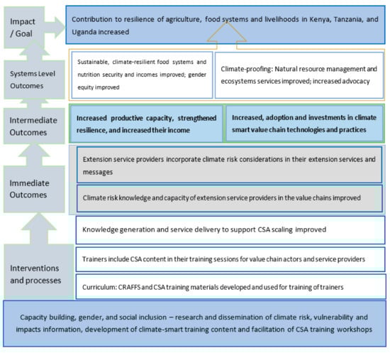 Theory of change/impact pathway for climate-resilient agribusiness Farmer Field School (CRAFFS) capacity building in Climate Resilient Agribusiness for Tomorrow (CRAFT). Source: authors.