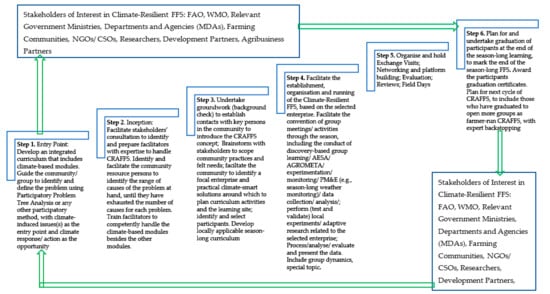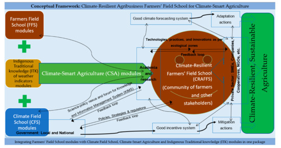 In an attempt to fill the gap, an innovative proof-of-concept comprising Climate-Smart Agriculture (CSA), FFS methodology, CFS and ITK modules has been proposed with these elements as a suitable combination [37]. Given the knowledge-intensive and multi-stakeholder nature of FFS, CFS, CSA and ITK, an innovative approach was needed to promote the harmonization of complementary attributes of these approaches. The innovative methodology integrates all four in one package, borrowing and embedding information and content from each to enrich the innovation. CGIAR Research Program on Climate Change, Agriculture and Food Security East Africa (CCAFS EA) is working with partners to make this innovation happen, by integrating climate resilience into the FFS to develop a climate-resilient agribusiness FFS (CRAFFS) approach for CSA. The initiative targets four categories of beneficiaries, namely (i) farmers and farmer organizations/cooperatives, (ii) all- and medium-sized enterprises (SMEs) in agribusiness, (iii) local service providers/extension agents and (iv) government officials/policy makers. Entry points include small scale agribusinesses (SMEs and farmer cooperatives), along with selected crop value chains [1], farming systems and institutional environment.