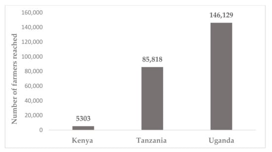 Through the CRAFFS ToT/ToF and MToT implementation, by the end of 2020, the process had reached 29 business cases (Table 5), covering a total of 1004 farmers in Kenya, 16,247 farmers in Tanzania and 27,665 farmers in Uganda trained on CSA technologies, practices and innovations—a total of 44,916 (Figure 6). Additional mobilization of 97,050 farmers in 10 business cases post-training took the tally to 237,250 by end of 2020.