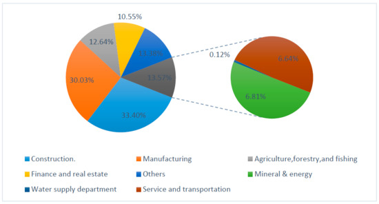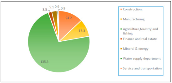 In terms of water consumption, the sector that consumes the most water in Hebei Province is the agricultural sector, with a total consumption of 13.53 billion m3 (72.2% of total water consumption), followed by the construction sector (2.42 billion m3), and the manufacturing sector with (1.73 billion m3). These three sectors account for more than 94% of the total water consumption in Hebei Province. The data on water consumption in each sector and its share are shown in Figure 4.