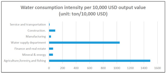 The parameters of the model, such as water consumption and input–output coefficients and the consumption-to-income ratio of residents, can be indirectly calculated from the data in the input–output table of water resources regulation. Their calculation methods have been explained in the research described above. The water consumption intensity of each sector in Hebei Province is shown in Figure 5. The agriculture sector has the highest water consumption of 1493.1 tons for 10,000 USD output value, followed by the water supply sector and the construction sector. The service and transportation sector has the lowest water consumption intensity (10.6 tons for 10,000 USD output value). The consumption to income ratio for rural residents is 0.51; for urban residents it is 0.36.