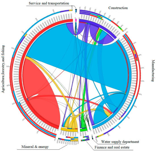 The water resources input–output relationship among the various sectors in Hebei Province is shown in Figure 6. The agricultural sector in Hebei Province is the main water-using sector. Furthermore, it exports a large amount of its water to other sectors in the form of agricultural product inputs, with the manufacturing sector being the most dependent on the agricultural sector, followed by the construction sector, and then the mineral and energy sector. The sector with the second largest amount of water transfer to other sectors is the construction sector. Its water is mainly transferred to the manufacturing sector and the finance and real estate sector. This indicates a high degree of interdependence between these sectors. The manufacturing sector features the third highest transfer; its main transfer targets are the mineral and energy sector, the construction sector, and the agriculture sector, in descending order. The rest of the sectors have weaker relative water transfer relationships and consume less water than the above sectors. In terms of the virtual water transfer of Hebei Province to and from other regions in the country, only the manufacturing sector and the service and transport sector are net virtual water importers; the other sectors are all net virtual water exporters.