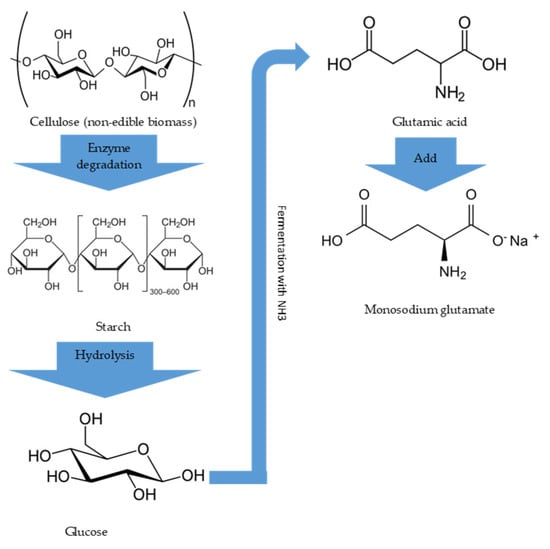 In Figure 2, it is shown how rice straw in the form of cellulose is pulverized to starch and hydrolyzed to glucose in order to produce the raw MSG material. The fermentation–purification–isolation production process, after glycosylation, is the same as in the non-edible biomass and tapioca starch methods.