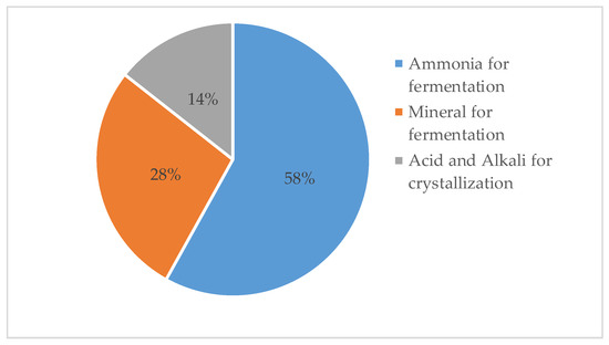 The WSFP of the sub-raw materials is 103 L per kg MSG. In the breakdown of the sub-raw materials, the ammonia source for fermentation, where the unit input and inventory are both relatively high, accounts for 60%; the acid and alkali of crystallization account for 25%; the minerals for fermentation accounts for 15%.
