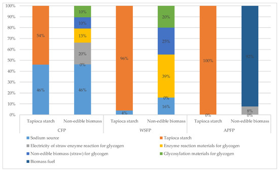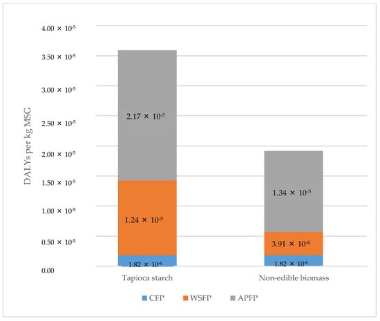 Figure 9 shows the APFPs of MSG from non-edible biomass and tapioca starch, which are 1.34 × 10−5 DALYs per kg MSG and 2.17 × 10−5 DALYs per kg MSG, respectively. The APFP of non-edible biomass decreased by 40% due to the prevention of smoke air pollution from open burning.