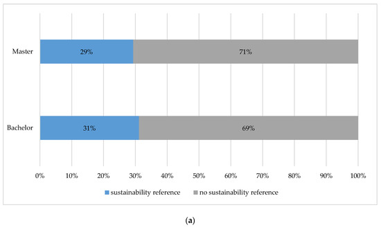 On average, 29% of all master’s study programs and 31% of all bachelor’s study programs show evidence of a reference to sustainability (see Figure 2a). In accordance with this, sustainability is addressed to an equal extent in undergraduate studies and post-graduate studies, thus leading to the development of both basic level knowledge and specialist knowledge in the field.