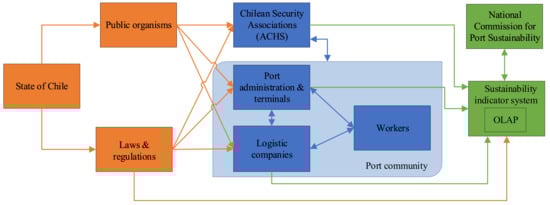 Based on the information gathered in the previous stages, the system was designed by identifying its components, characteristics, and the interactions between its components. State agencies, legal frameworks and regulatory mechanisms were incorporated. As a result of the institutional responsibilities and operational activities that are developed and established among the different components, a mixed, public/private body, called the National Council of Port Sustainability, was introduced in the design. In a more specific scope of the port system, public and private companies were introduced; the instances of interaction among them were defined, as well as other organisms not necessarily productive, but determining in the context, such as the achs.