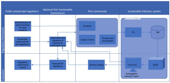 In the area of port communities, monitoring protocols to help decision-making are established for the private companies system. The framework of regulations and public policies will favor integration, coordination, and trust between workers, unions, and ports; as well as the adequate coordination with the achs. The different actors that intervene in this area assume the commitment to provide the information the system needs to measure sustainable management with the use of indicators. This process is carried out through the computer tools related to Business Intelligence that etl the data to transform it into information and knowledge [52]. The computer tools will be available to public organizations linked to ports and private companies that are authorized by law.