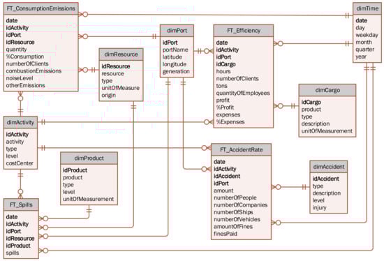 On the other hand, the adoption of technologies is an important tool to extract information and knowledge through the monitoring of port logistics processes [23]. The constant follow-up and monitoring of the indicators that reflect the “health status” of the sustainability of a company or production system, requires not only the implementation of operating procedures or protocols, but also the collection of timely, coherent and reliable information on the state and evolution of the production processes [24,25]. For several decades, computing has provided the tools and support necessary to store and manage data to such an extent that the amount of information available has itself become another problem [26]. Given that sustainability assessment represents a multidimensional problem, it is necessary to provide tools that allow exploring this multidimensionality, for which analytical approaches such as OLAP are very useful in circumstances such as those described in this paragraph [27].