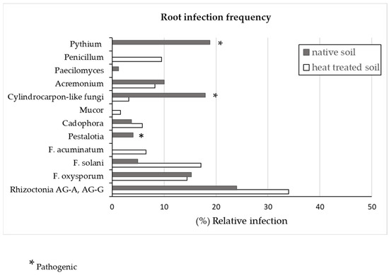 Conversely, Pythium sp., Cylindrocarpon-like fungi (which were mainly represented by Dactylonectria torresensis) and Pestalotia longisetula showed a highly negative Pearson correlation with plant growth. These findings suggest the pathogenicity role of the latter fungal species, shown in Figure 1, from which it is possible to observe a dramatic reduction of root infection by those pathogens in strawberry plants grown in heat-treated soil (Figure 1).