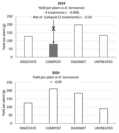 Pseudomonas quantity in rhizosphere was not correlated with strawberry yield (r: −0.07 and 0.18 in 2019 and 2020, respectively). On the contrary, D. torresensis overall resulted negatively correlated with strawberry yield, thus confirming its role of pathogen as expected based on the preliminary test (Table 2). In 2019, the correlation between yield and Cylindrocarpon-like fungi was null, but net of the anomalous value of Compost treatment showing phytotoxic effect (Figure 2, 2019 and Figure 3). Cylindrocarpon-like fungi (D. torresensis) negatively correlated with marketable yield (r: −0.43). A significant yield increase in plots treated in pre-plant with Dazomet and Compost was observed in 2020, when the highest (r: −0.95) negative correlation between yield and D. torresensis was recorded (Figure 2, 2020). The latter finding supported the hypothesis that Compost was able to suppress Cylindrocarpon-like fungi during the second growing cycle.