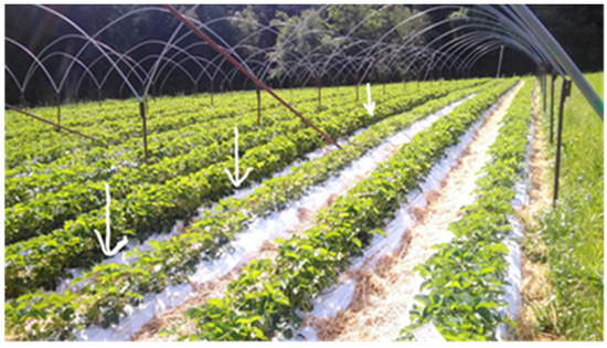 Spring 2019, strawberry vegetative stage at first growing cycle. Plants showing homogeneous vegetative growth reduction in one of three replicates (row below the white arrows) treated with COMPOST from OFMSW in pre-plant.