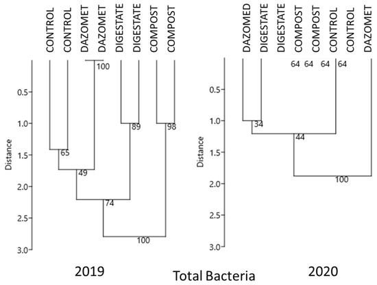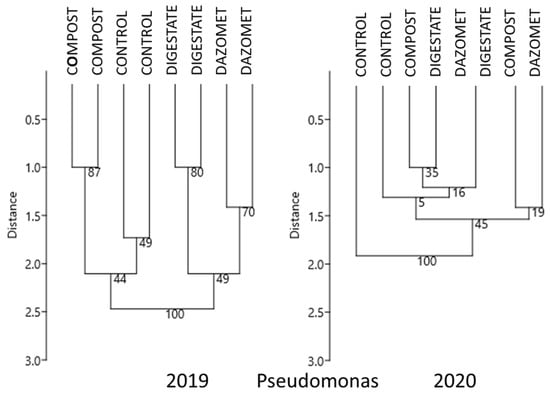 Total bacteria and Pseudomonas communities differed significantly between soil treatments in 2019, 13 months after soil treatments, while in 2020, 23 months after soil treatments, they did not (Table 5). UMPGA dendrograms grouped the communities of both total bacteria and Pseudomonas according to soil treatments in 2019, which did not occur in 2020 (Figure 4). In addition, in 2019 both bacterial communities showed a larger genetic distance from one another than in 2020. Findings of both AMOVA and UMPGA clustering clearly showed that all soil treatments were able to affect rhizosphere bacterial composition up to 13 months after application. On the contrary, that effect was not recorded in 2020 when bacterial communities in untreated and treated soil showed much lower distance in genetic composition as compared to the previous year (Figure 4).