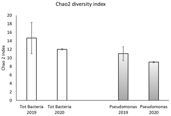 Mean Chao 2 diversity index of total bacteria and Pseudomonas spp. communities in treated soils (DAZOMED, COMPOST, DIGESTATE). Controls, not included in this comparison, did not differ in Chao2 diversity index between 2019 and 2020 accounting for a lower value (about 8.4). Bars represent standard deviation inferred with bootstrap replicates.