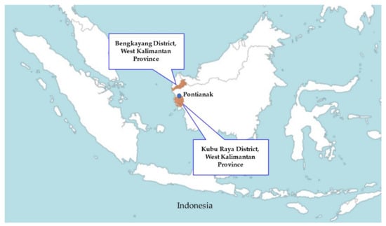 This case study was conducted from October 2017 to March 2018 using a combination of qualitative and quantitative methods. The target areas of this research were Kubu Raya District and Bengkayang District in West Kalimantan Province, Indonesia, which encompasses the 16 target villages in which the VFT approach was implemented. Among these 16 villages, eight villages (Limbung, Mekar Sari, Rasau Jaya I, and Rasau Jaya Umum in Kubu Raya District, and Sungai Jaga A, Sungai Raya, Sungai Duri, and Sungai Pangkalan II in Bengkayang District), which are representatives of the socioeconomic and cultural diversity of the 16 target villages, were selected for the questionnaire survey. Four villages out of the eight villages (i.e., Limbung and Mekar Sari in Kubu Raya District, and Sungai Jaga A and Sungai Raya in Bengkayang District) were randomly selected as target villages for the interview survey.