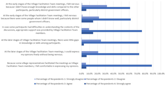 Nearly 60% of the respondents agreed that there were clear ground rules on how to participate in discussions when joining VFT meetings. For instance, some interviewees explained that paying attention, listening to other participants’ ideas, and not talking or interrupting while others were speaking were some of the ground rules introduced at VFT meetings that helped participants listen to other people’s opinions carefully and express their own ideas. Regarding forum exclusiveness, as we confirmed that no other collaborative project or activities with similar goals were being conducted in the target villages, this component was satisfied.