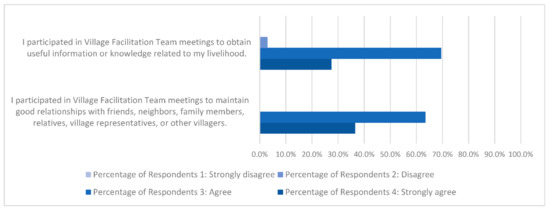 The survey results indicated that the majority of the project participants had certain incentives to join the meetings, and no serious constraints were observed. Most participants freely participated in VFT meetings to obtain knowledge and maintain interpersonal relationships. A total of 97% of the respondents answered that they participated in VFT meetings to obtain useful information or knowledge related to their livelihoods (Figure 4), and 87.5% participated because they were reluctant to miss the opportunity to obtain important information. Interviewees mentioned that they expected to learn about agricultural and forestry techniques, including measures to improve productivity, manage pests and weeds, and produce value-added products. Some also reported experiencing anxiety about missing essential information on land burning rules and about incurring disadvantages if they were unaware of the laws and regulations.