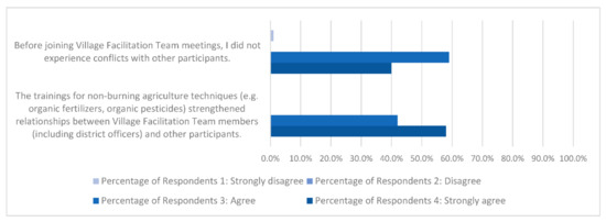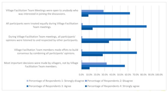 The study findings demonstrated that the VFT approach mostly fulfilled the components of a sound institutional design suggested by Ansell and Gash [1]. Although some villagers mentioned that VFT meetings were often attended by group leaders assigned by the village heads or village offices, 71.5% of the respondents perceived that VFT meetings were open to anybody interested in joining the discussion (Figure 6). Not only the key stakeholders, such as the leaders of farmers’ or women’s groups, but also elders, young people, and schoolteachers participated in these meetings. Some interviewees mentioned that women were also able to join VFT meetings if they wanted to participate. A vast majority (96%) agreed that most participants actively joined VFT meetings. The decisions made during VFT meetings and the progress of activities were reported and shared with relevant stakeholders, including the district government, village office, MOEF, and villagers.