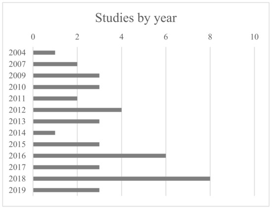 To retain the most relevant literature, only papers which meet the following criteria are kept: (1) the paper studies intermodal or synchromodal freight transport; (2) it contains at least one source of uncertainty and (3) it presents a planning model. The scope of this review is limited to network and flow planning in continental intermodal and synchromodal transport. For instance, the study from Pizzol [28] was not selected because although it includes uncertainty in an intermodal network, it focusses on the uncertainty of emissions rather than intermodal planning. Terminal operations and maritime transport are also left out of this review and therefore papers such as Carlo et al. [29,30,31] are omitted. Drone delivery concerns small packages, which is why studies of this transport mode are left out. This left us with 42 references, which are classified into different planning levels. Table 1 shows the number of studies on each planning level and type of uncertainty. Studies that consider multiple uncertain elements appear several times. The number of studies per year is shown in Figure 1. This figure indicates that the focus on uncertainty in intermodal transport planning is a recent development, with most of the research performed in the last ten years. The year 2018 appears as an outlier with the most publications. Figure A1 in Appendix A lists the number of studies per journal, which shows a vast range of journals with a single reference. Only the European Journal of Operational Research, Transport Research part B: Methodological and Transport Research part E: Logistics and Transportation Review contain three or more references.