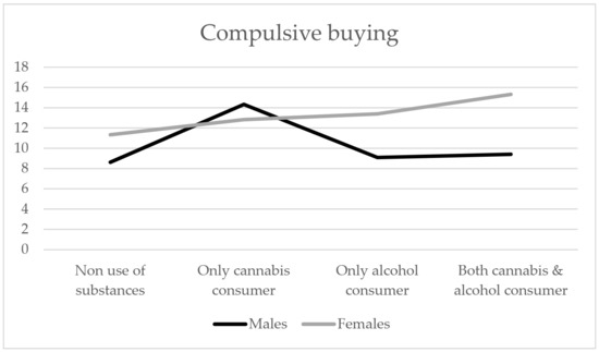 There was also an interaction effect between alcohol and cannabis use on the compulsive buying habits of the analysed sample. In this case, the subjects scoring highest in compulsive buying were those who did not consume alcohol but who did use cannabis (M = 13.33, SD = 5.07) as represented in Figure 4. The scores were quite similar and even lower than those in the previous case for those subjects who only consumed alcohol (M = 11.70, SD = 4.61) or who used both substances (M = 12.10, SD = 5.59). The non-use of any of the above indicated substances was related to the lowest scores for compulsive buying (M = 9.73, SD = 4.20). As shown in Table 1, this interaction had the smallest size effect, which can be considered moderate–low (partial eta squared of 0.007).
